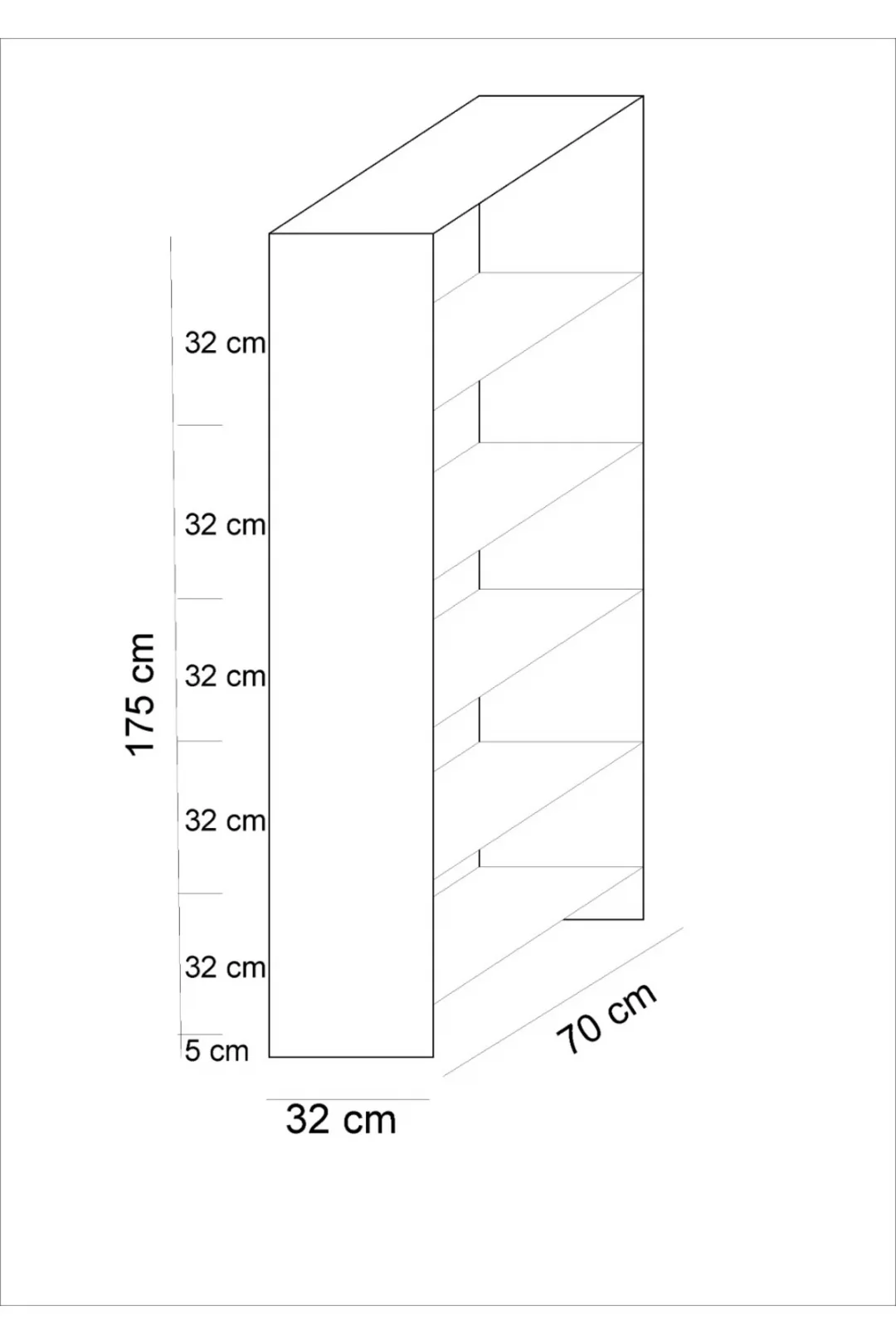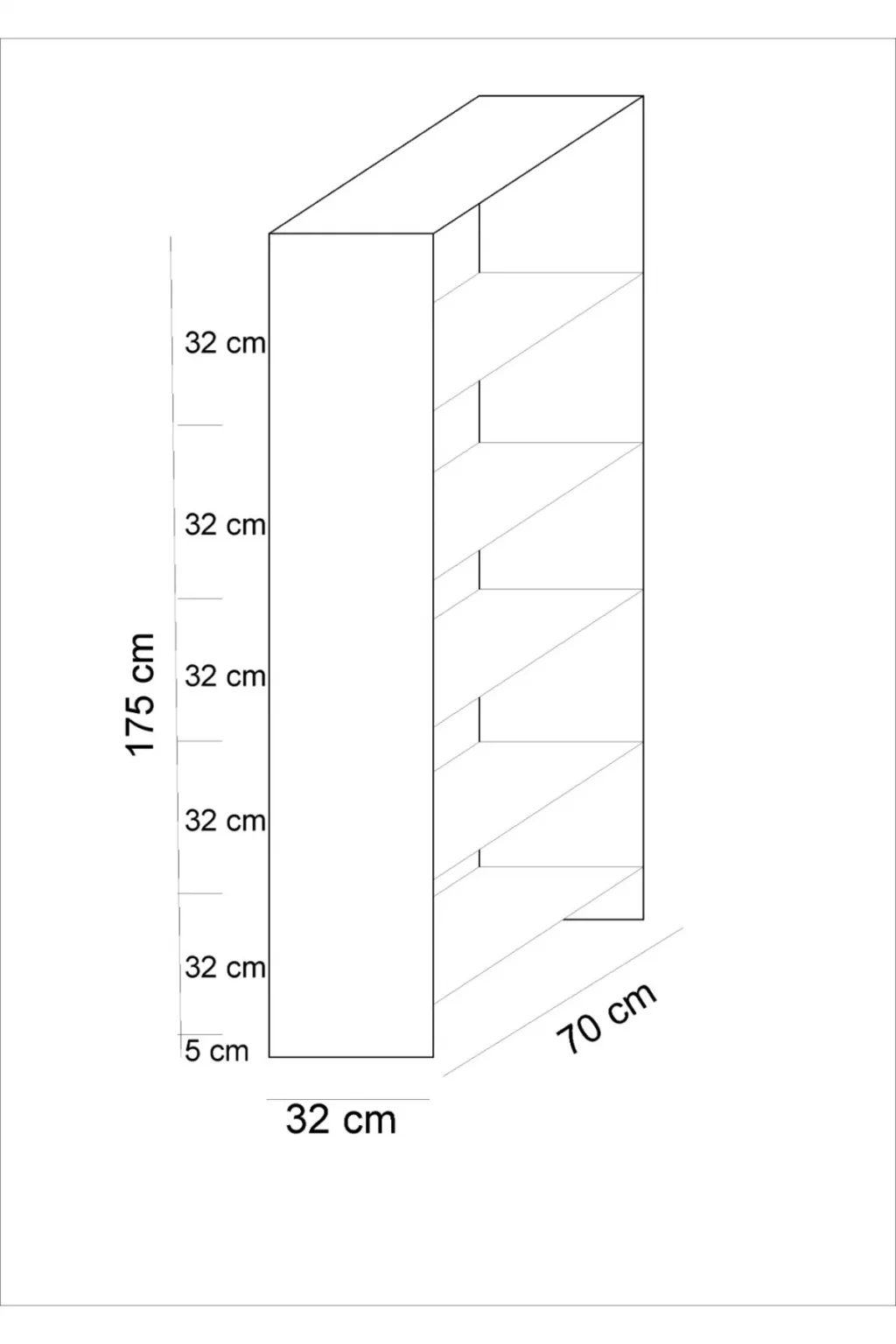 Ölçüler: Yükseklik: 175 cm • Genişlik: 70 cm • Derinlik: 32 cm Raf Aralığı: 32 cm
