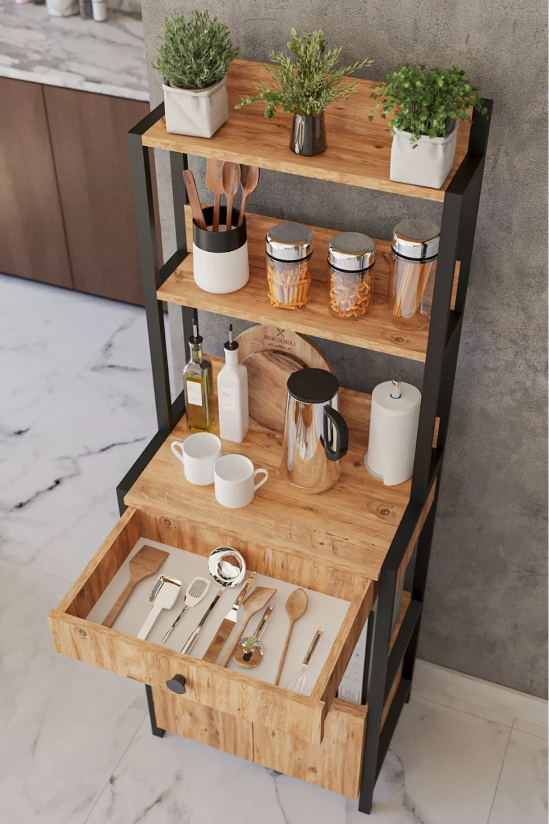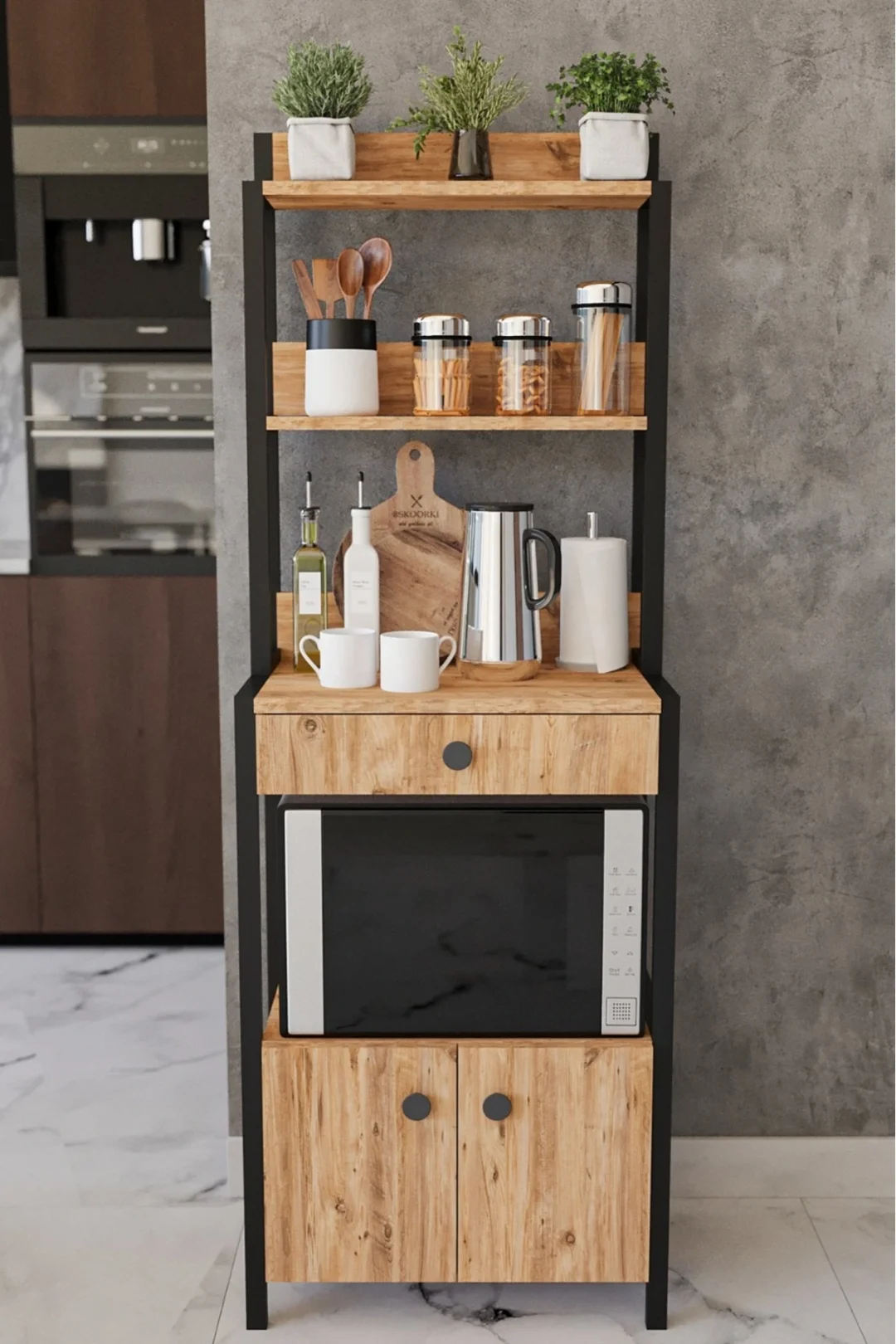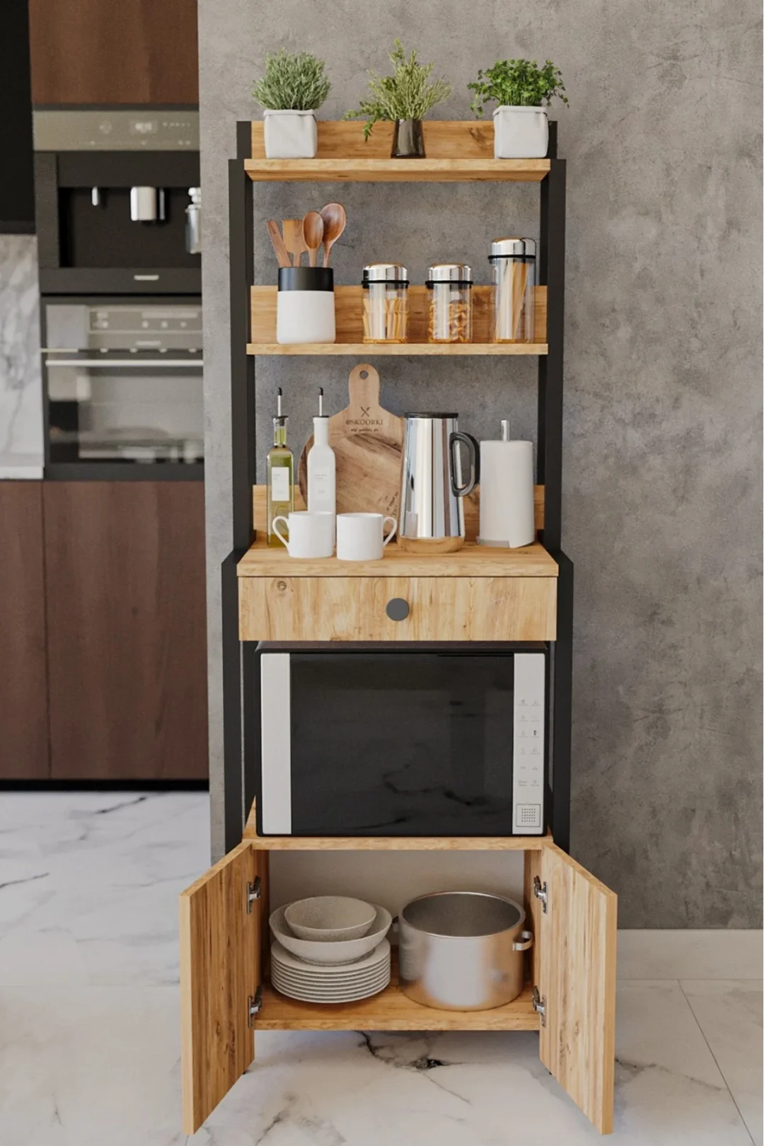 -Çekmeceli 2 kapaklı Çok Amaçlı Dolap Mutfak Bangosu Mikrodalga Fırın Mini Fırın Dolabı 2 Kapaklı Dolap Kahve Köşesi Retro tasarımıyla mutfak dekorasyonunuza Nostaljik bir dokunuş ekler.