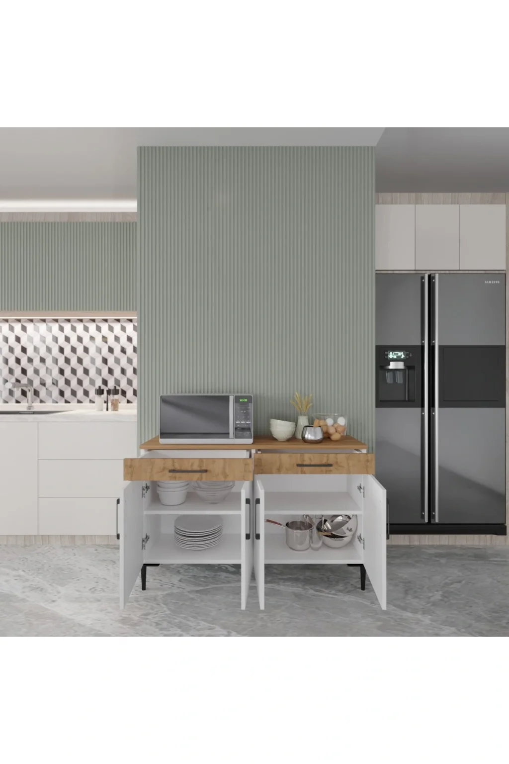 Geniş Depolama Alanı: Geniş yüzey ve iç hacim ile mutfak eşyaları, tabaklar, servis ürünleri veya dekoratif objeler için ideal.
